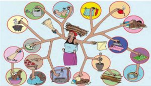 Een plattelandsvrouw heeft soms de neiging zichzelf te vergeten ten voordele van haar kinderen en het hele gezin. Ze heeft de last om voor het hele gezin te zorgen zonder capaciteit. Omdat ze het goed wil doen, denkt ze er niet meer aan om ontmoetingen te promoten of het initiatief te nemen om met haar vrienden uit te gaan. Aan jezelf denken is echter essentieel voor het evenwicht van het gezin. De onderstaande afbeelding toont ons de last van vrouwelijke boeren op het platteland