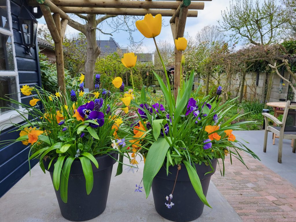 In de bollenmand van dit jaar zitten maar liefst 65 bollen in Soroptimistkleuren, wat garant staat voor een heel voorjaar afwisselende bloei. Tot de bollen hun kopjes boven de aarde uitsteken, zien de manden er al leuk uit met violen. We maken ook manden en potten in ‘Orange the World’-stijl: met oranje violen.