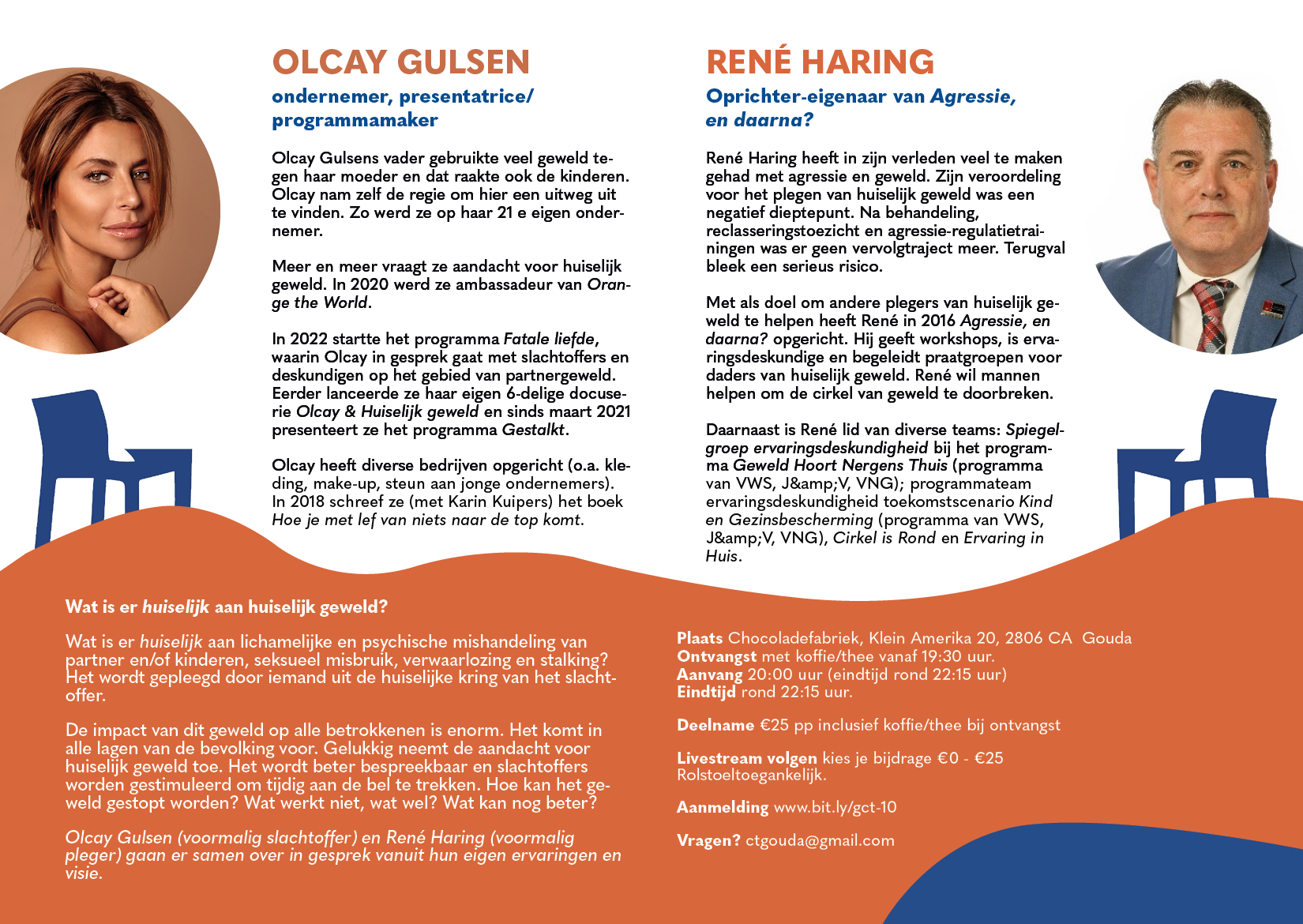 In de sfeervolle omgeving van de Chocoladefabriek in Gouda interviewen Olcay Gulsen (voormalig slachtoffer) en René Haring (voormalig pleger) elkaar over een heftig en gevoelig onderwerp. Huiselijk geweld. Ieder vanuit hun eigen ervaringen en visie. Juist nu, in de actieperiode van Orange the World.