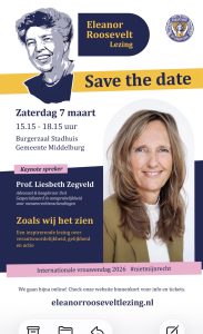 Vanwege Internationale Vrouwendag organiseert onze club op 7 maart de eerste Eleanor Roosevelt Lezing! In de Burgerzaal van het Stadhuis aan de Markt in Middelburg ontvangen we die middag prof. Liesbeth Zegveld. Vanaf 15.15 uur ben je van harte welkom! Meer info volgt binnenkort op deze website: eleanorrooseveltlezing.nl