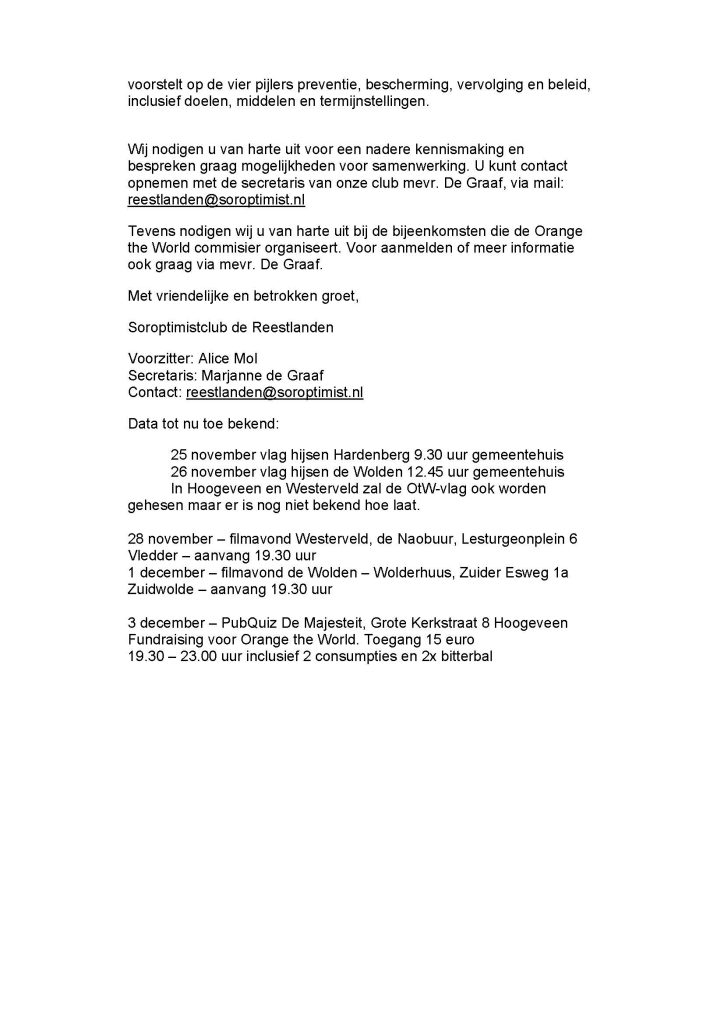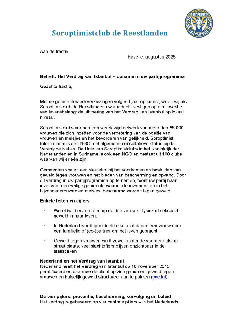 Soroptimitclub De Reestlanden schreef aan alle lokale politieke partijen die meedoen aan de gemeenteraadsverkiezingen van de gemeenten Hardenberg, Hoogeveen, De Wolden en Westerveld de brief die hieronder is te lezen.