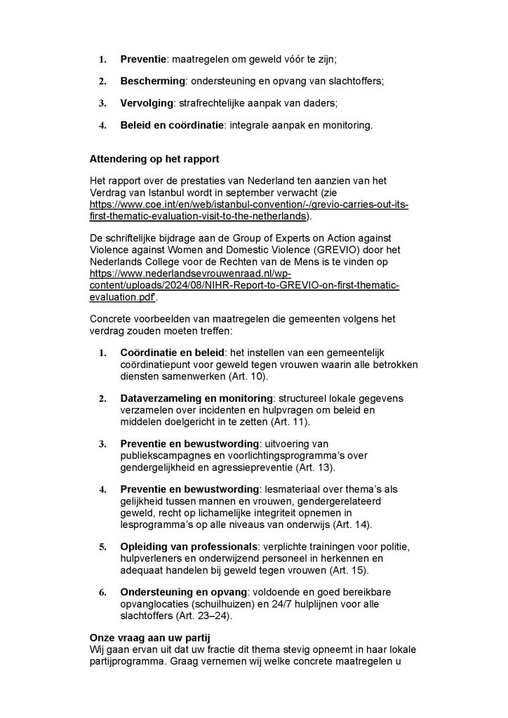 Gemeenten hebben verantwoordelijkheden ten aanzien van het bestrijden van geweld tegen vrouwen en het naleven van de richtlijnen van het verdrag van Istanbul. Met de verkiezingen op komst in maart 2026, kunnen we echt verschil maken als we politieke partijen ervan overtuigen dat ze in hun partijprogramma’s aandacht besteden aan veiligheid voor vrouwen en het tegengaan van geweld achter de voordeur.