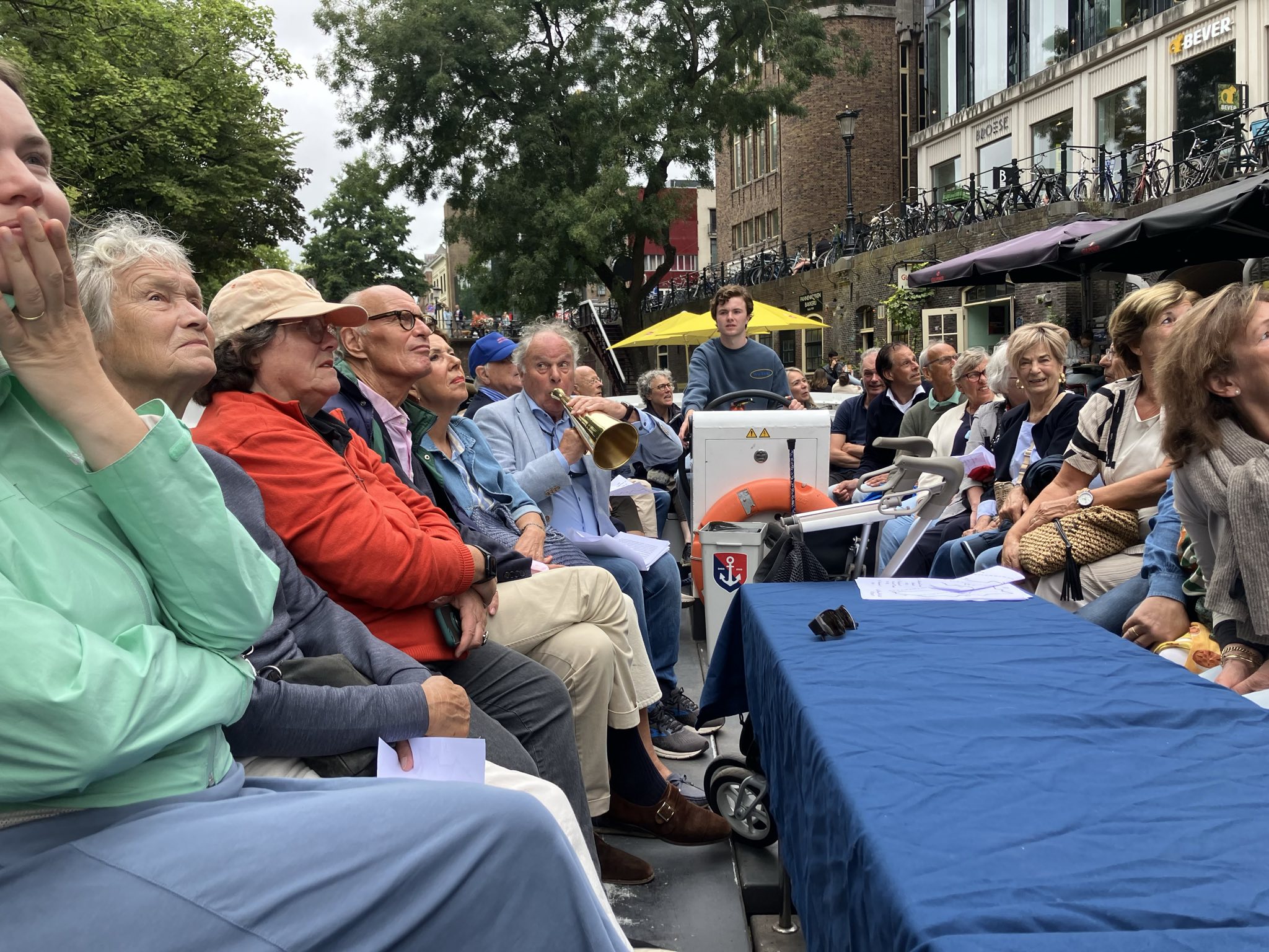 Het was drie keer een feest de zonovergoten stad vanaf het water te bekijken. Sinds een aantal jaar mag Utrecht het UNESCO predicaat City of Literature dragen. Daarom droeg de gids Willem Hendrik Gispen ook fragmenten van gedichten over Utrecht voor. Wat opviel was het bloeiende horecaleven op de kaden van de Oudegracht met daar ver boven de schitterend gerenoveerde Domtoren, icoon van Utrecht. Op de singels de rust in het Zocherpark rond