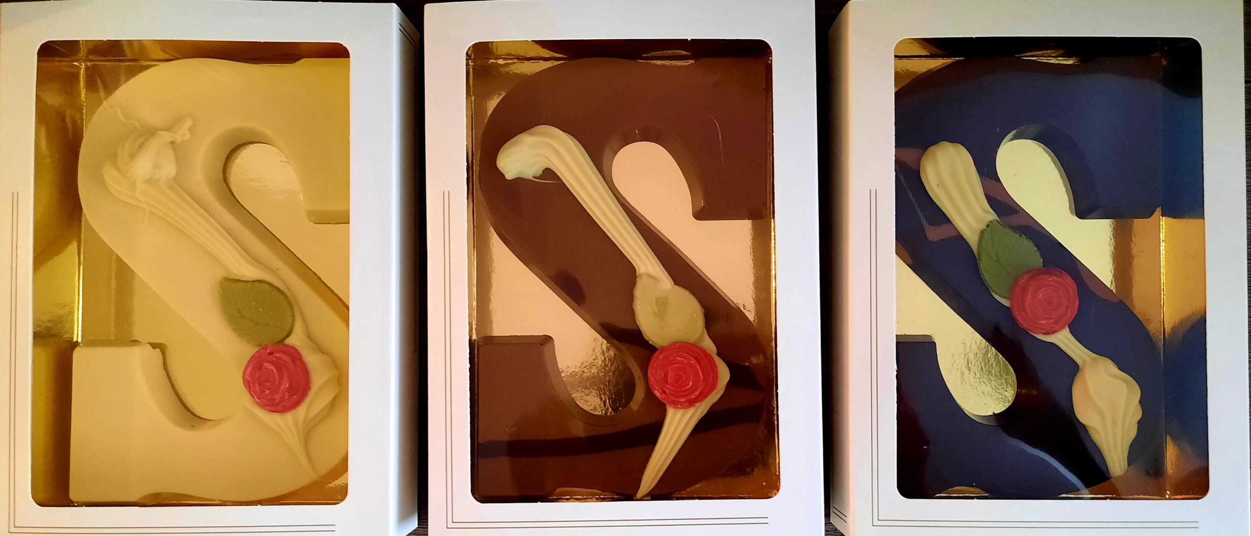 De letters zijn te bestellen in witte, melk, of pure uitvoering. Kosten : € 6,95 per stuk
