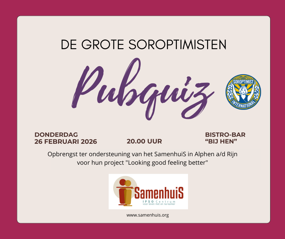 Na het grote succes van vorig jaar organiseeert de Soroptimistenclub Alphen aan den Rijn voor de tweede keer de Grote Soroptimisten pubquiz. Dit keer ondersteunen we het project ‘Looking good feel better’ van het SamenhuiS. Een locatie waar mensen met kanker en hun familieleden even aan iets anders kunnen denken of deelnemen.
