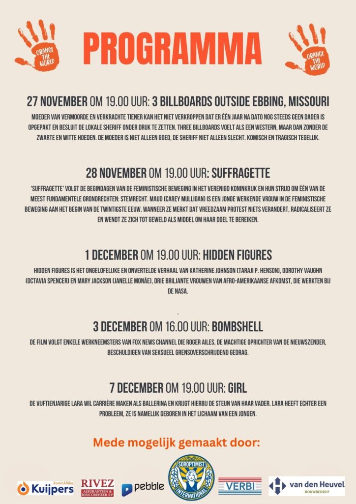 Van 27 november tot en met 7 december organiseert Soroptimistclub Helmond-Peelland een filmfestival in het kader van Orange the World.