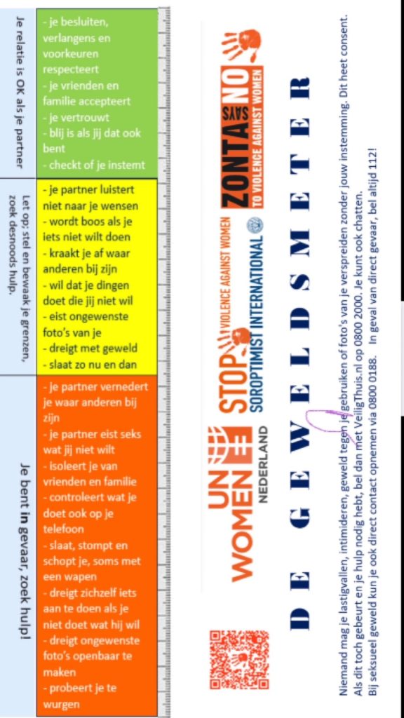 Op woensdag 29 november 17.00 verlicht Wethouder Carla Kreuk van Gemeente Tiel de Waterpoort en de Sint Maartenskerk. Twee oranje bakens in de gemeenschap om ‘Stop geweld tegen meisjes en vrouwen’ te benadrukken.Deze week worden speciale viltjes en geweldmeters door gemeenteambtenaren aan de horeca uitgedeeld om het thema ‘veilig, overal en altijd’ onder de aandacht te brengen.