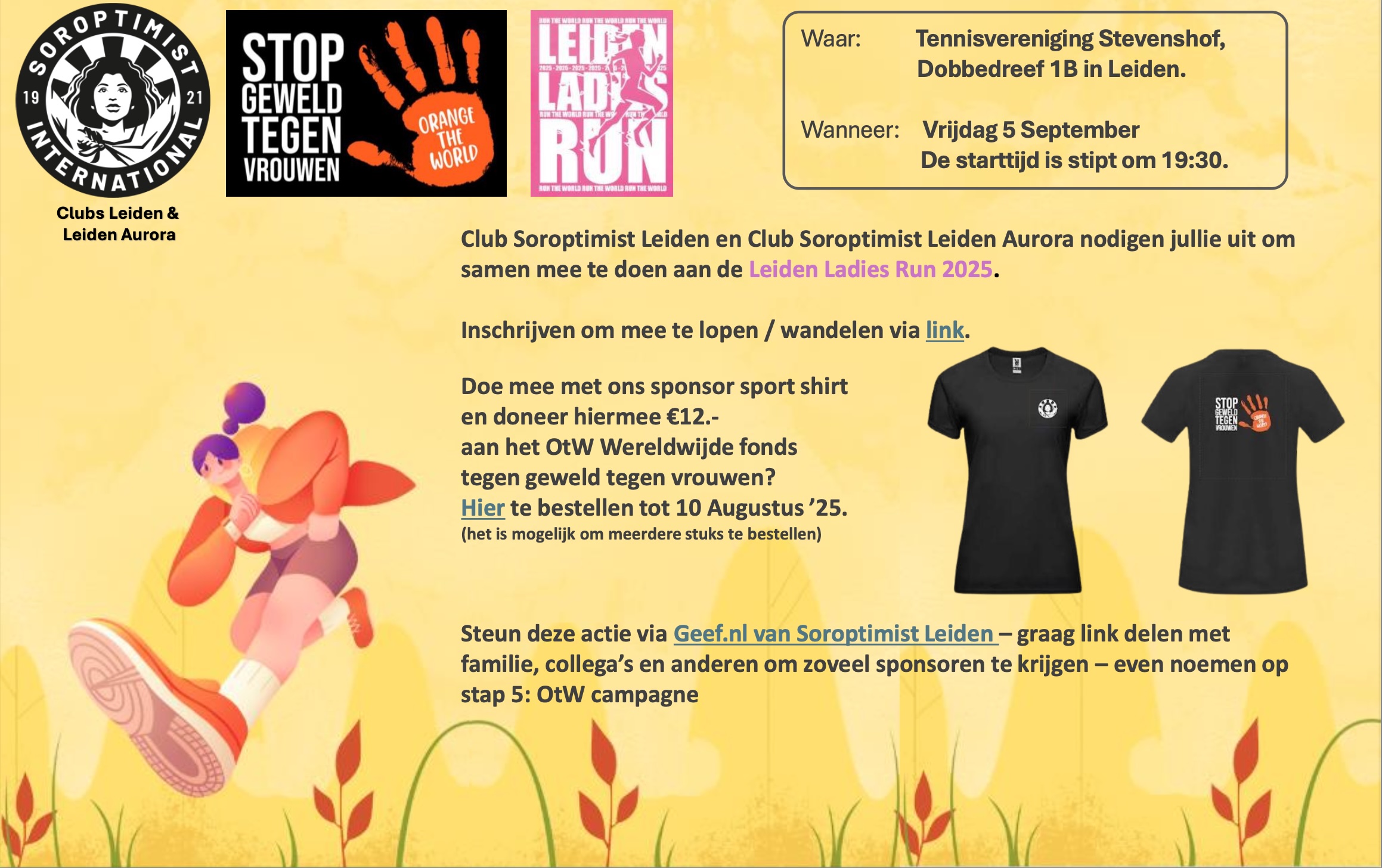 Club Soroptimist Leiden en Club Soroptimist Leiden Aurora nodigen jullie uit om 5 september mee te doen aan de Leiden Ladies Run 2025 om zo geld in te zamelen voor de Orange the World campagne Stop geweld tegen vrouwen