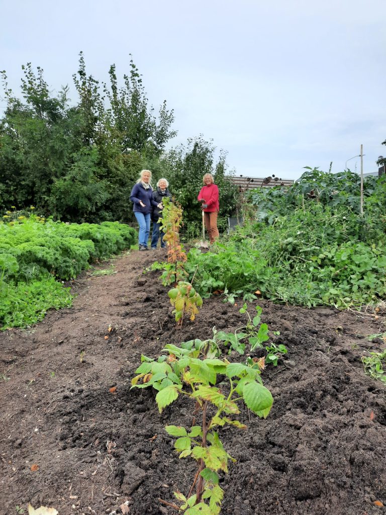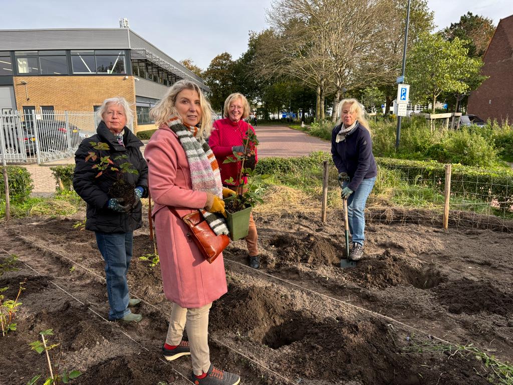 Rechts en onder 18-10-2023: Josine, Elzeline, Ineke en Sandra en druk in de weer met aanplant nieuwe fruitbomen