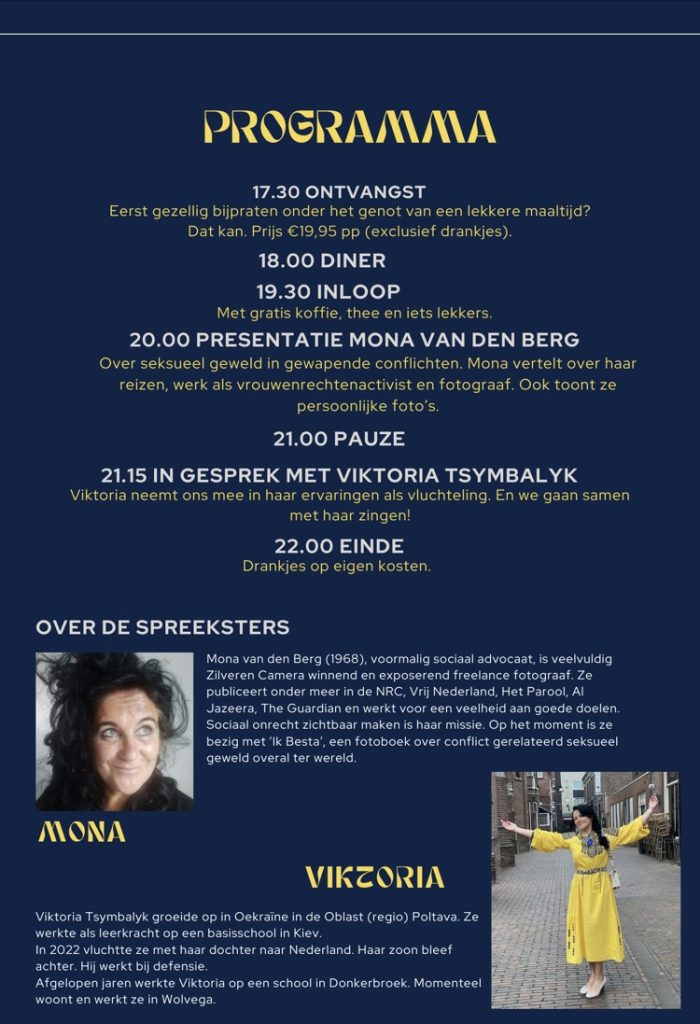 Op deze avond zijn er twee spreeksters: Mona van den Berg en Viktoria Tsymbalyk.