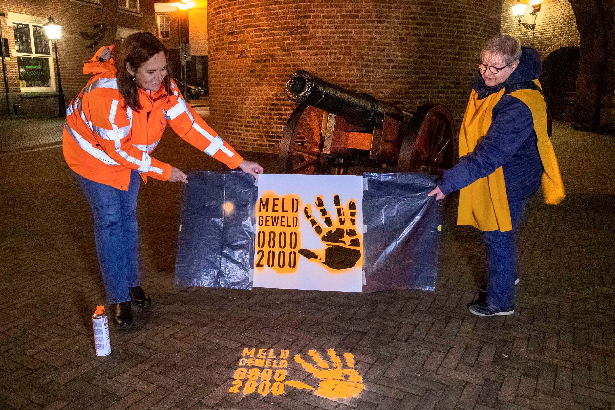 Jaarlijks worden Sassenpoort en Provinciehuis in Zwolle van 25 november tot 10 december oranje aangelicht. Op de foto Riksta Zwart van Soroptimistclub Zwolle, die samen met Coot Winkler Prins van Zontaclub Zwolle in 2020 aandacht vraagt voor Geweld tegen Vrouwen.