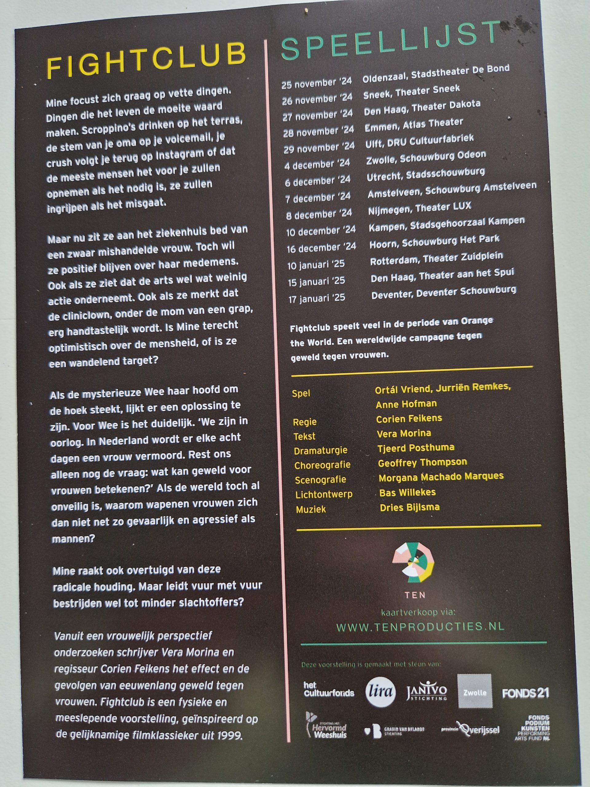 Vanuit een vrouwelijk perspectief onderzoeken schrijver Vera Morina en regisseur Corien Feikens het effect en de gevolgen van eeuwenlang geweld tegen vrouwen. Fightclub is een fysieke en meeslepende voorstelling, geïnspireerd op de gelijknamige filmklassieker uit 1999. Meer informatie hier.
