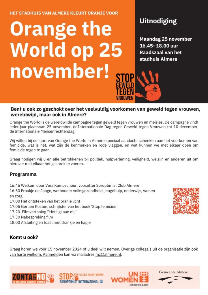 Soroptimistclub Almere doet ook in 2024 weer mee met de wereldwijde campagne tegen geweld tegen vrouwen, Orange the World.