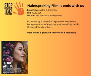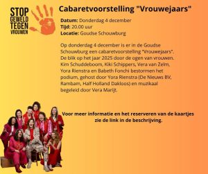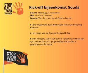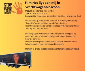 Orange The World 2025 Gouda e.o. Orange The World 2025 Gouda e.o. Soroptimistclub Gouda e.o. zet zich ook in 2025 weer in om Orange The World onder de aandacht te brengen! op diverse plaatsen in Gouda graffiti vd welbekende hand van OTW bierviltjes en posters in de kroegen oranje pumps bij winkels in het centrum boekenleggers bij diverse hulpverlenende instanties Activiteiten: 24 nov 17u: hijsen OTW-vlag Huis van de Stad Gouda 25 nov 9u: hijsen OTW-vlag Gemeentehuis Waddinxveen 26 nov 20u: Filmhuis Gouda, film Toxic 27 nov 20u: optredens en gastsprekers bij het Oude Stadhuis op de Markt van Gouda 4 dec 10-17u: Truck Open Mind bij het Huis van de Stad in Gouda 4 dec 20u: Cabaret ‘Vrouwejaars’ in de Goudse schouwburg Delen? Dat kan met: Terug naar overzicht
