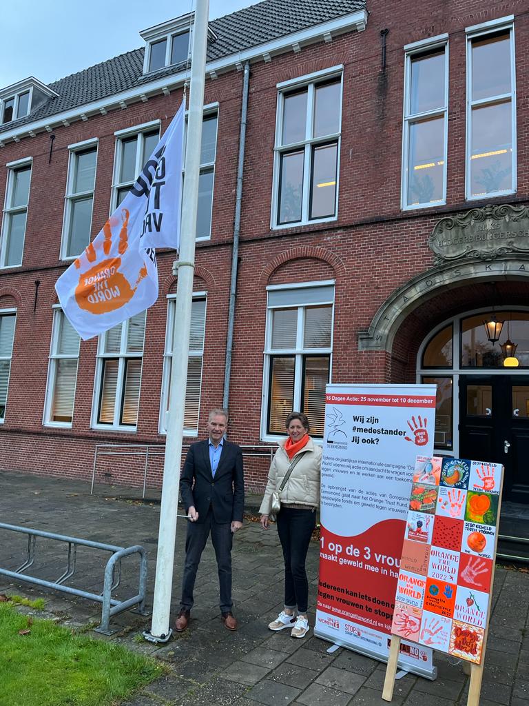 ’s Morgens werd in Appingedam de vlag gehesen door wethouder Meindert Joostens samen met Emma de Vries.