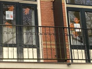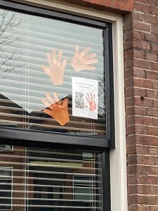Wil je ook meedoen? Knip, verf, schilder oranje handjes op de ramen en hang de poster er naast. De poster kun je hier downloaden.