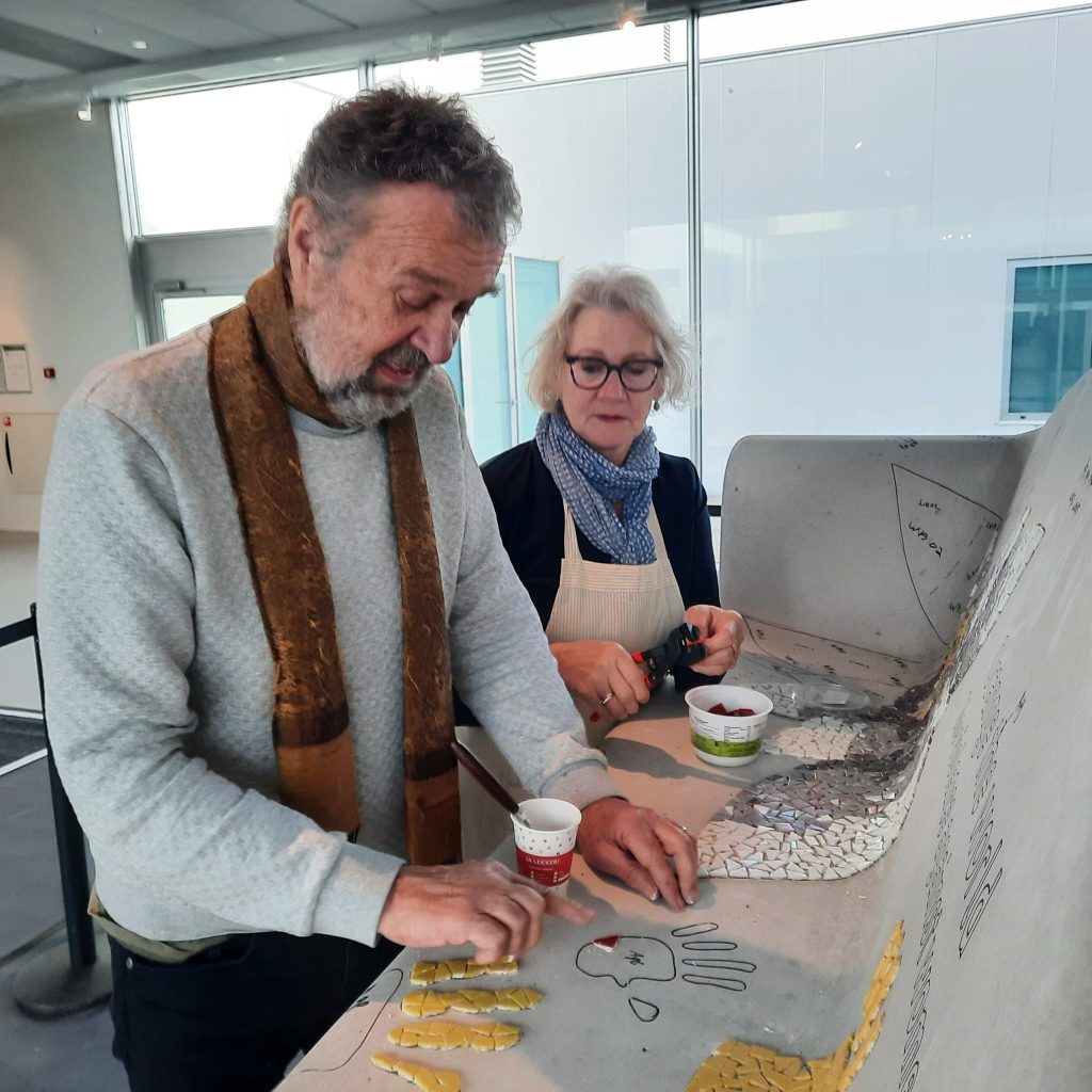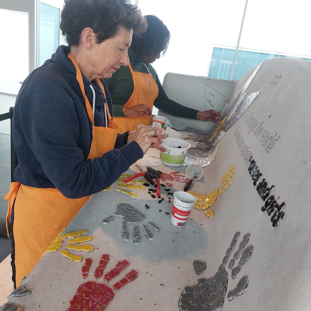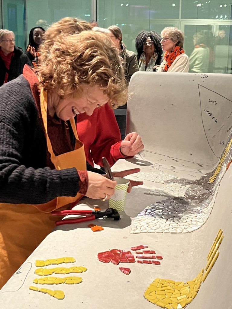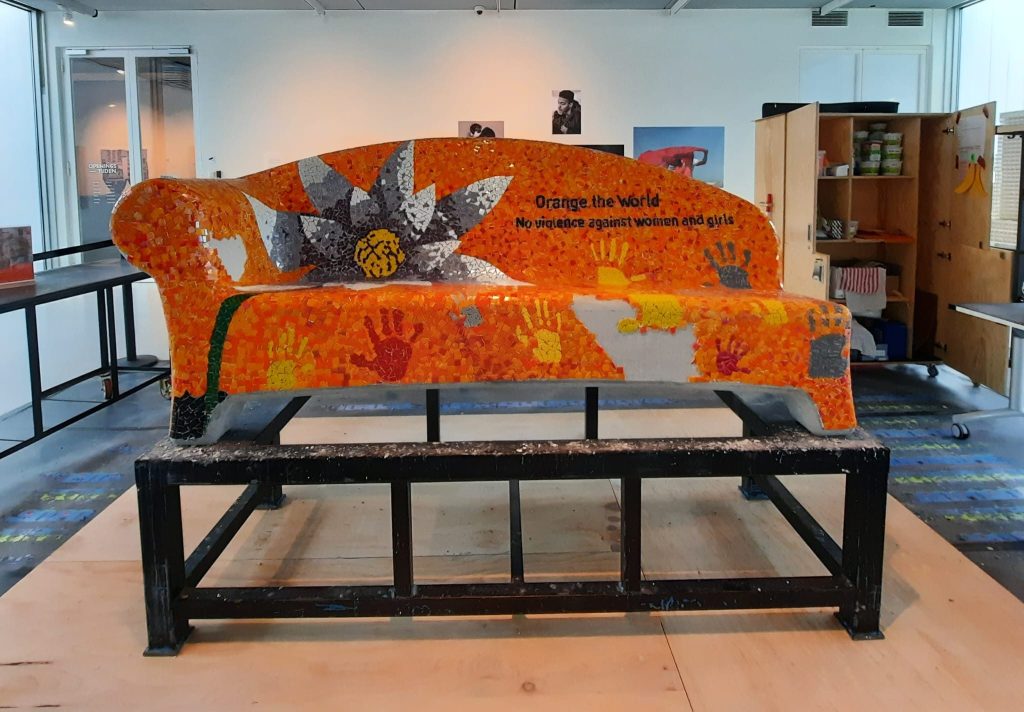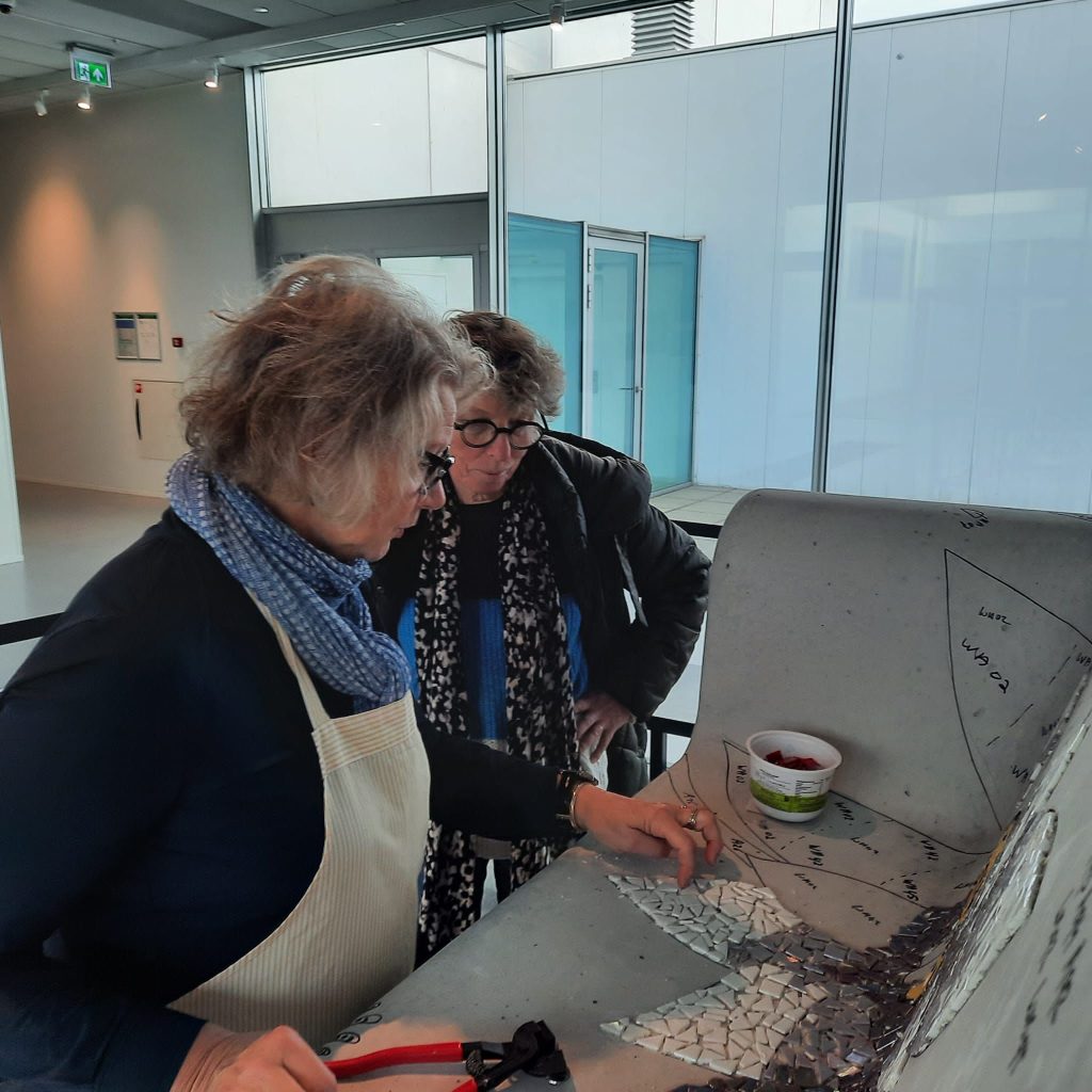 Er zijn vele helpende handen nodig om de mozaïekbank op tijd af te krijgen. De werkzaamheden vinden plaats in de “You Are Here-ruimte” van de Kunstlinie in Almere. Doet u ook mee? Van woensdag tot en met zondag werken we tussen 11.00 en 17.00 uur aan de bank. De Kunstlinie (officiële gastlocatie van Orange the World) stelt hiervoor een ruimte beschikbaar. U kunt hier ook een kijkje nemen om de bank alvast te bewonderen.