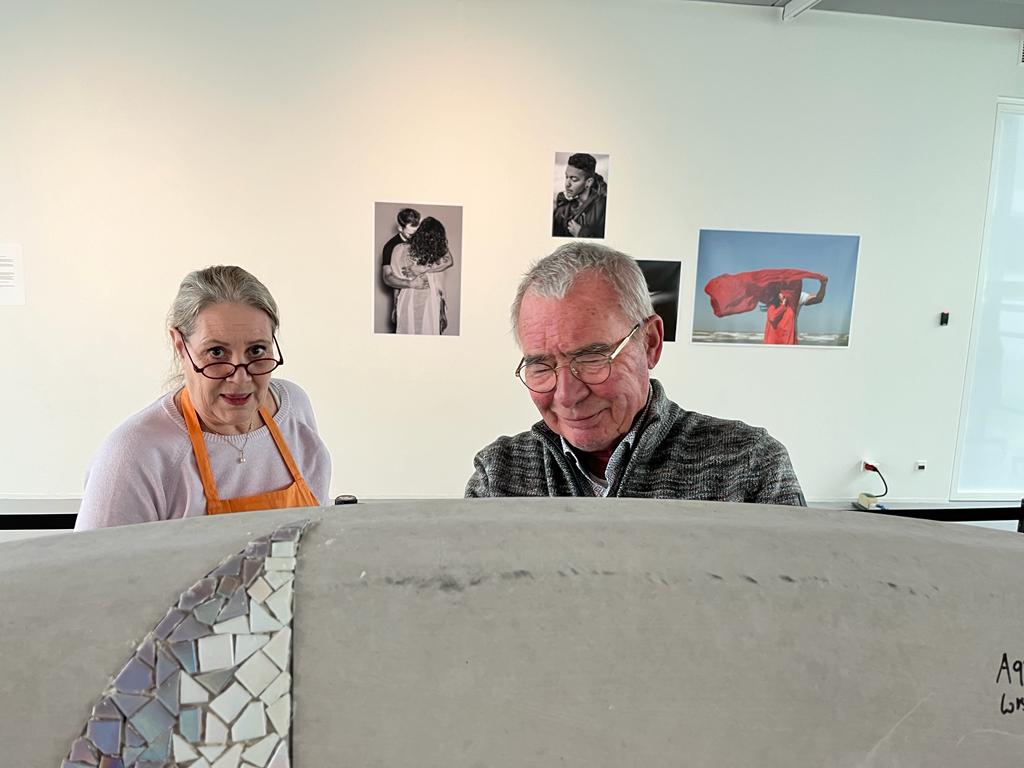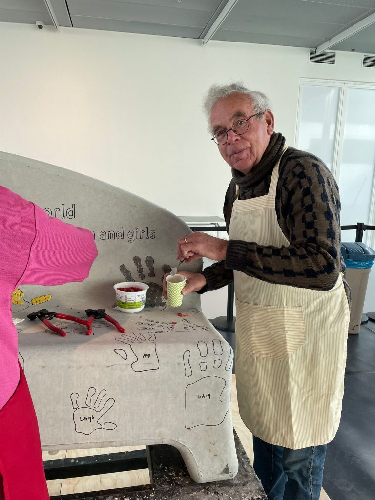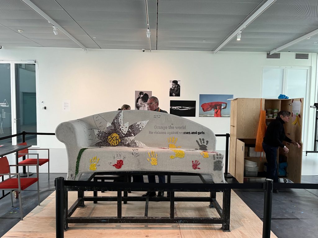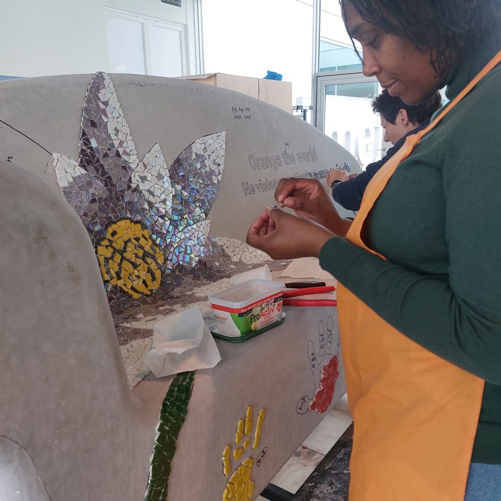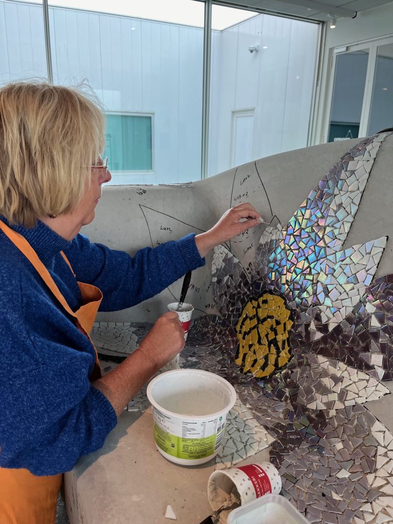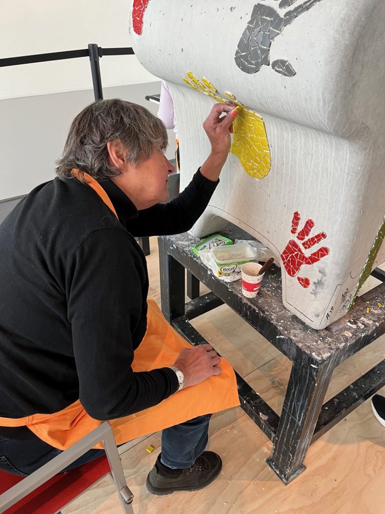 Er zijn vele helpende handen nodig om de mozaïekbank op tijd af te krijgen. De werkzaamheden vinden plaats in de “You Are Here-ruimte” van de Kunstlinie in Almere. Doet u ook mee? Van woensdag tot en met zondag werken we tussen 11.00 en 17.00 uur aan de bank. De Kunstlinie (officiële gastlocatie van Orange the World) stelt hiervoor een ruimte beschikbaar. U kunt hier ook een kijkje nemen om de bank alvast te bewonderen.