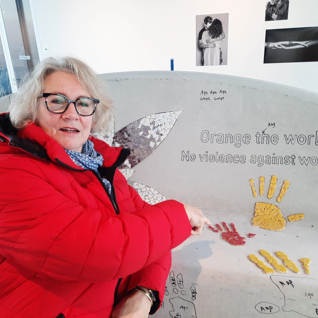 Bijna de helft van de Nederlandse vrouwen krijgt te maken met geweld in haar leven, door alle lagen van de bevolking heen en in alle gemeenten en provincies. In veel steden staat er al zo’n Orange The World bank. Wilt u ons hiermee helpen? Het creëren van de bank is te volgen; u kunt een bezoek brengen aan de Kunstlinie waar in de “You Are Here- ruimte” gewerkt wordt aan de bank. Draagt u ook uw steentje bij? Dat kan door 20 steentjes voor € 5.00 te doneren via onderstaande QR code. Onze dank is groot, doneer en kom kijken! Wethouder Froukje de Jonge droeg ook al haar steentje bij (zie foto’s hieronder).