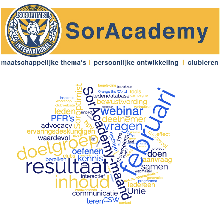 | 5 | Een aanvraag bij het Soroptimist Vrouwenfonds. Hoe doe ik dat? | woensdag 14 februari, 20 uur zaterdag 17 februari 10 uur |