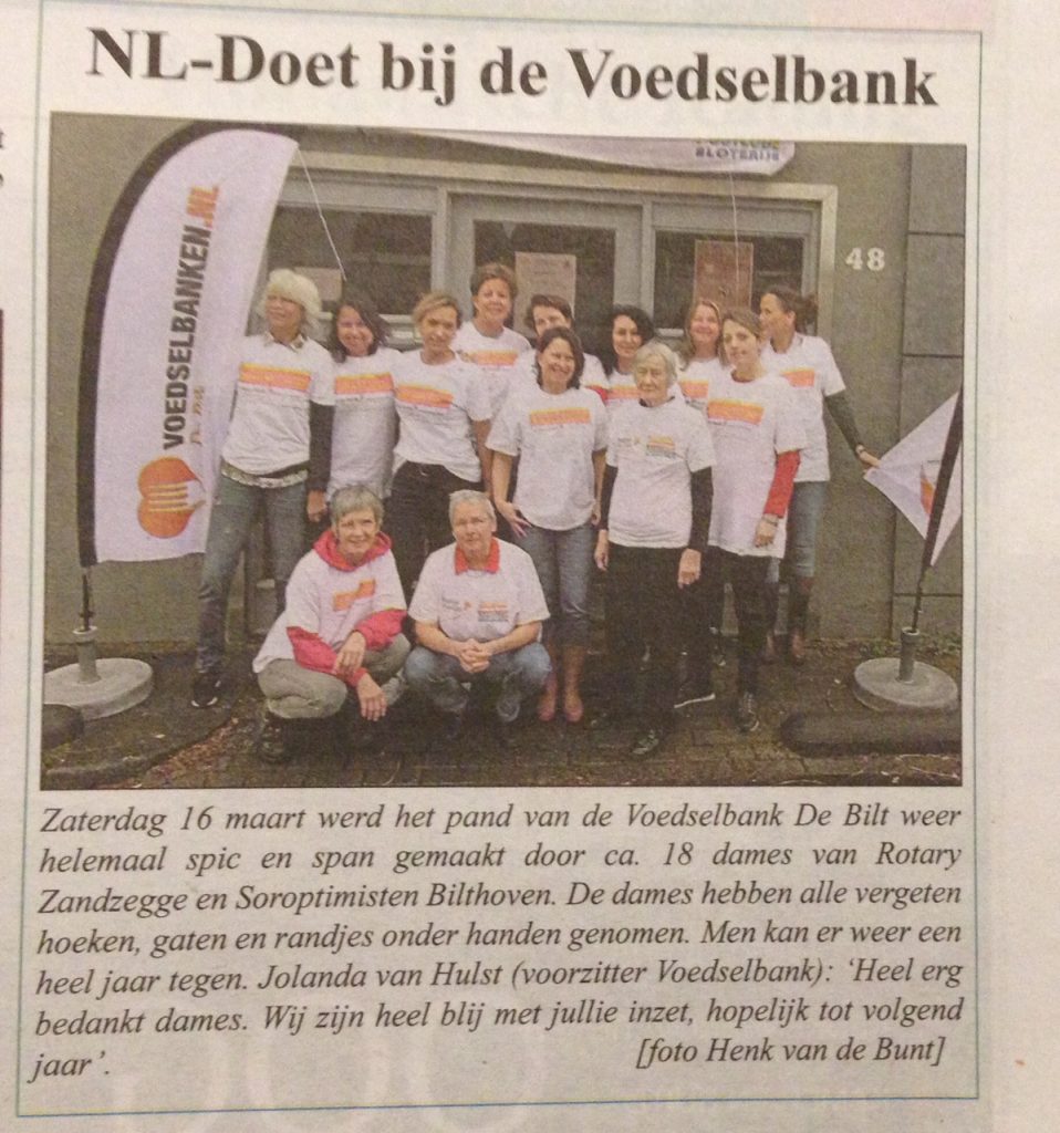 Tijdens NL Doet op 16 maart 2019 zullen leden van Soroptimistclub De Bilt-Bilthoven samen met leden van andere serviceclubs uit de gemeente de handen uit d mouwen steken om het pand van Voedselbank De Bilt spik en span te maken.