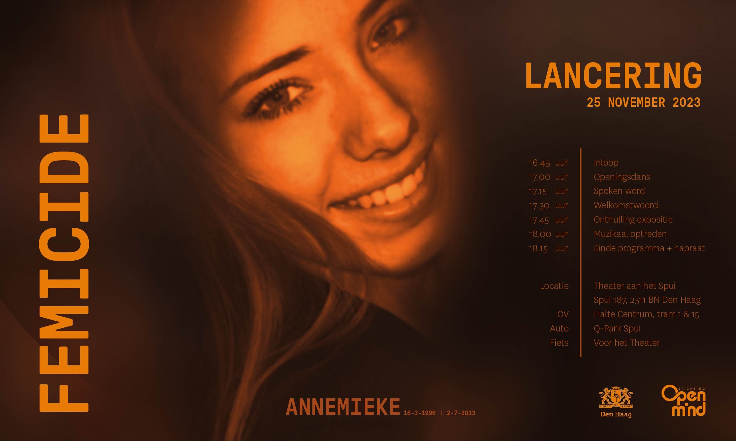 Om femicide onder de aandacht te brengen bundelen stichting Open mind, de gemeente Den Haag en de nabestaanden van slachtoffers van femicide hun krachten. De reizende expositie FEMICIDE brengt de verhalen van twaalf slachtoffers die door hun (ex-)partner zijn omgebracht, verteld door de nabestaanden. De foto’s en openhartige verhalen maken de afschuwelijkheden van deze moorden voelbaar en tonen de levenslange impact hiervan op de nabestaanden.