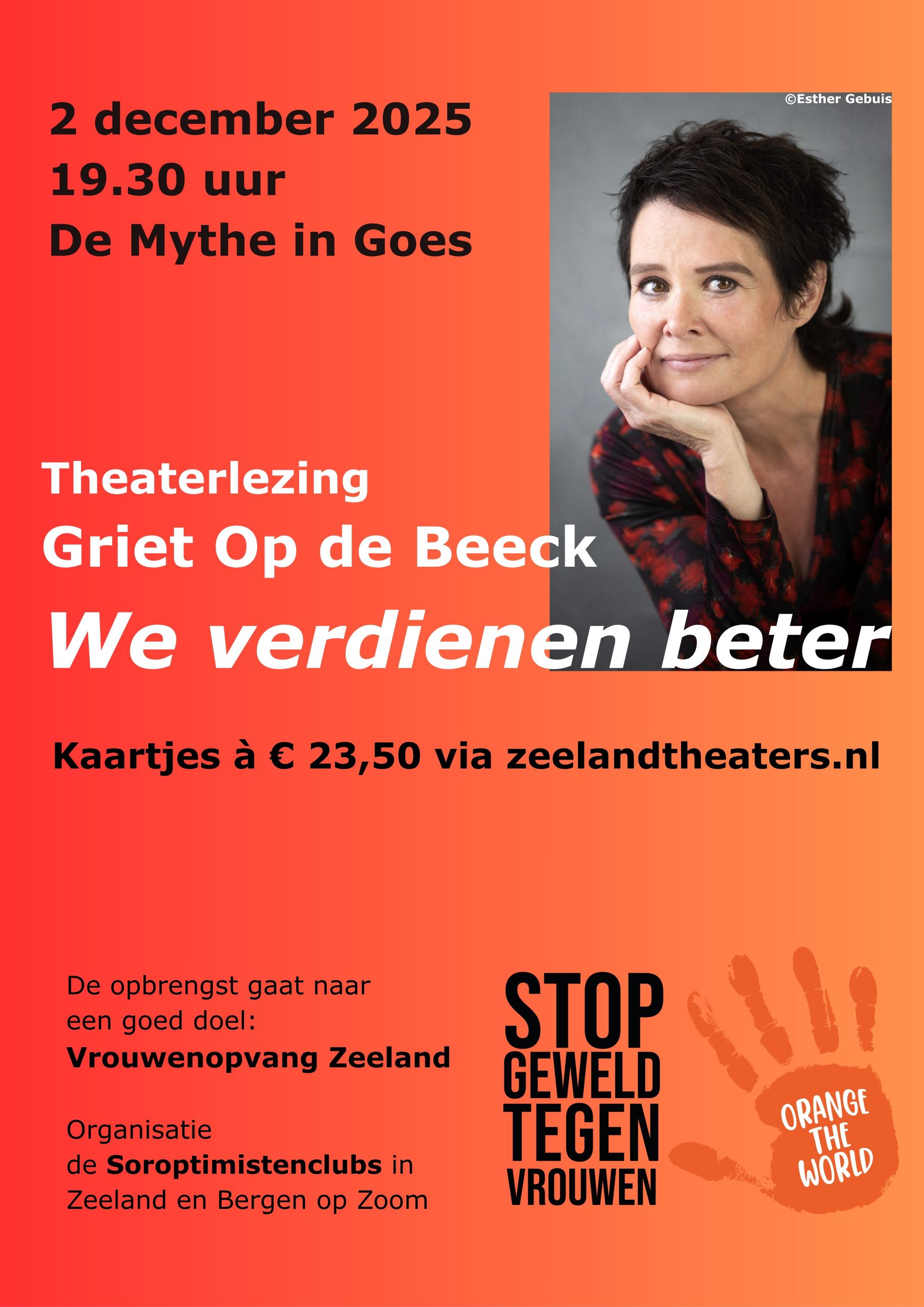 Vijf Soroptimistenclubs slaan de handen ineen en vragen aandacht voor het bestrijden van geweld tegen vrouwen en meisjes. Om geld in te zamelen voor een goed doel organiseren we op dinsdag 2 december 2025 in De Mythe in Goes een bijzondere avond met Griet Op de Beeck. Kom naar haar theaterlezing We verdienen beter!