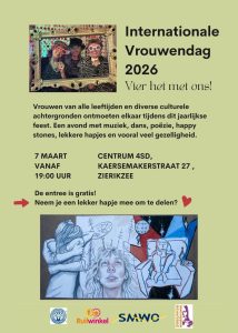 Internationale Vrouwendag 2026: vier het met ons! Lees Voor Vrouwen van alle leeftijden en culturele achtergronden ontmoeten elkaar tijdens dit jaarlijkse feest. Een avond met muziek, dans, poëzie, happy stones, hapjes en vooral veel gezelligheid. De entree is gratis! Neem je een lekker hapje mee om te delen? Kaersemakerstraat 27, Zierikzee Delen? Dat kan met: Terug naar overzicht