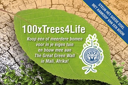 Met het kopen van een (fruit)boompje steun je het Project 100xTrees4Life. Van de opbrengst worden bomen geplant in Ghana en worden Ghanese vrouwen opgeleid om deze bomen te verzorgen en in een collectief een inkomen te verwerven.
