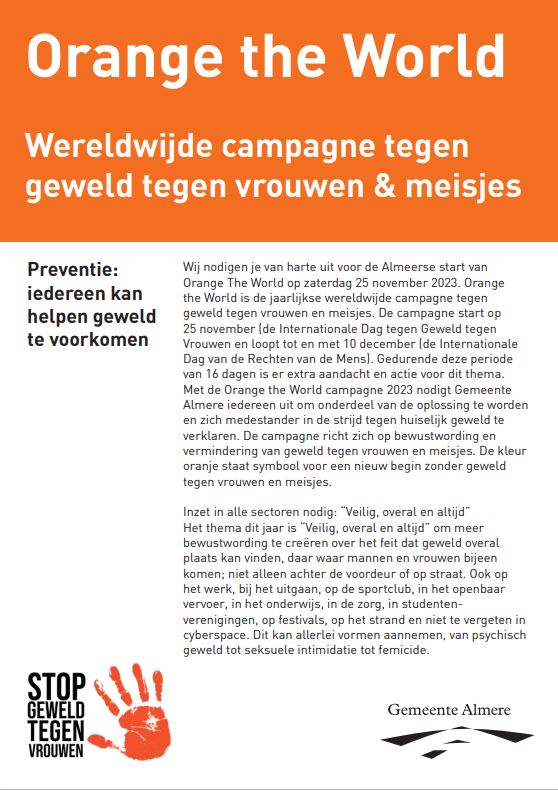 Jaarlijks vragen wij van 25 november tot en met 10 december aandacht voor Orange the World. Dit is een wereldwijde campagne om geweld tegen vrouwen en meisjes te stoppen.