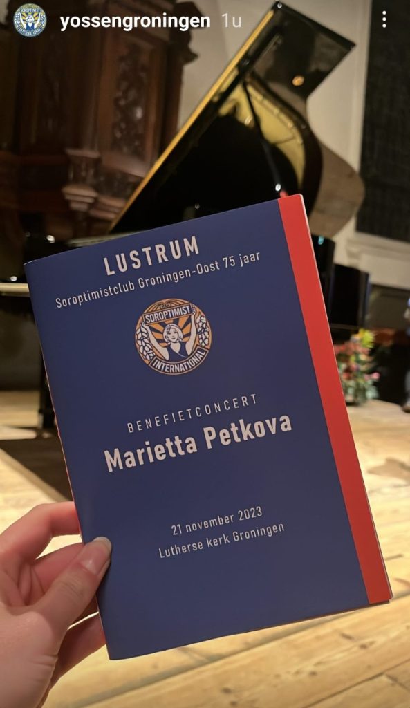 Op dinsdagavond 21 november geeft meesterpianiste Marietta Petkova, lid van Soroptimistclub Almere, een benfietconcert in de Lutherse kerk te Groningen. Dit concert wordt georganiseerd door Soroptimistclub Groningen-Oost. Meer informatie over het concert en hoe u kaarten kunt reserveren, vindt u hier.
