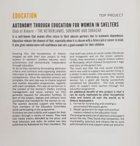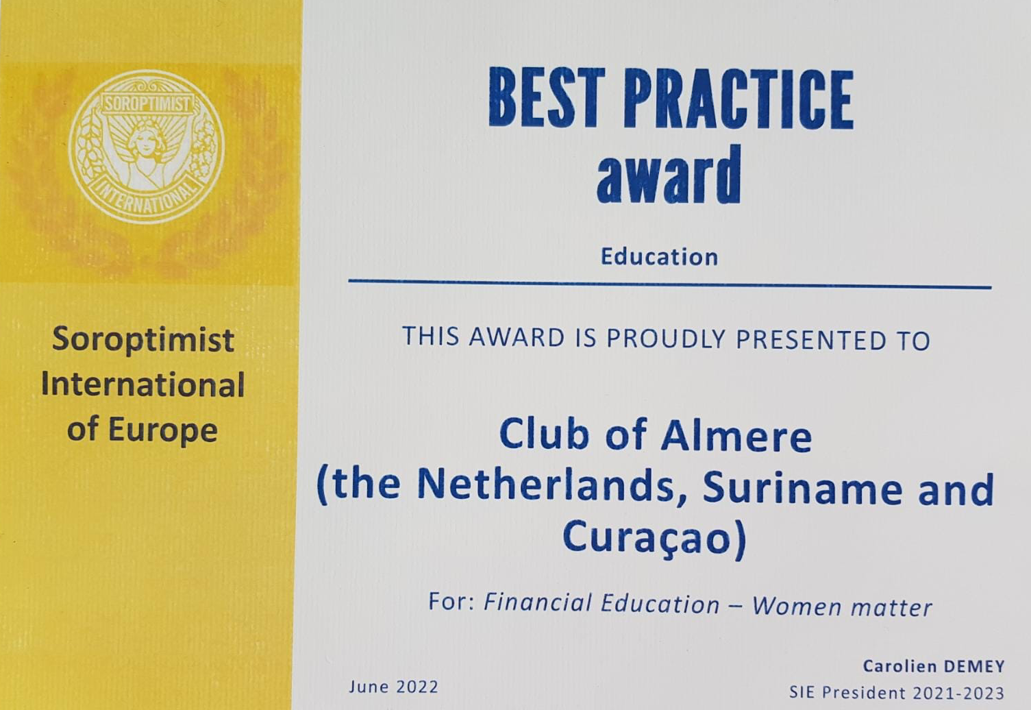 Op 26 juni 2022 heeft Soroptimistclub Almere de Europese Best Practice Award gewonnen in de categorie Education met het Educatiefonds voor vrouwen uit het Oranjehuis, een opvang voor vrouwen die te maken hebben (gehad) met geweld in de thuissituatie.