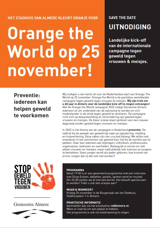 Wij nodigen u van harte uit voor de Nederlandse start van Orange The World op 25 november in de Burgerzaal van het stadhuis van Almere. Kijk voor meer informatie over het programma hieronder of bekijk deflyer.