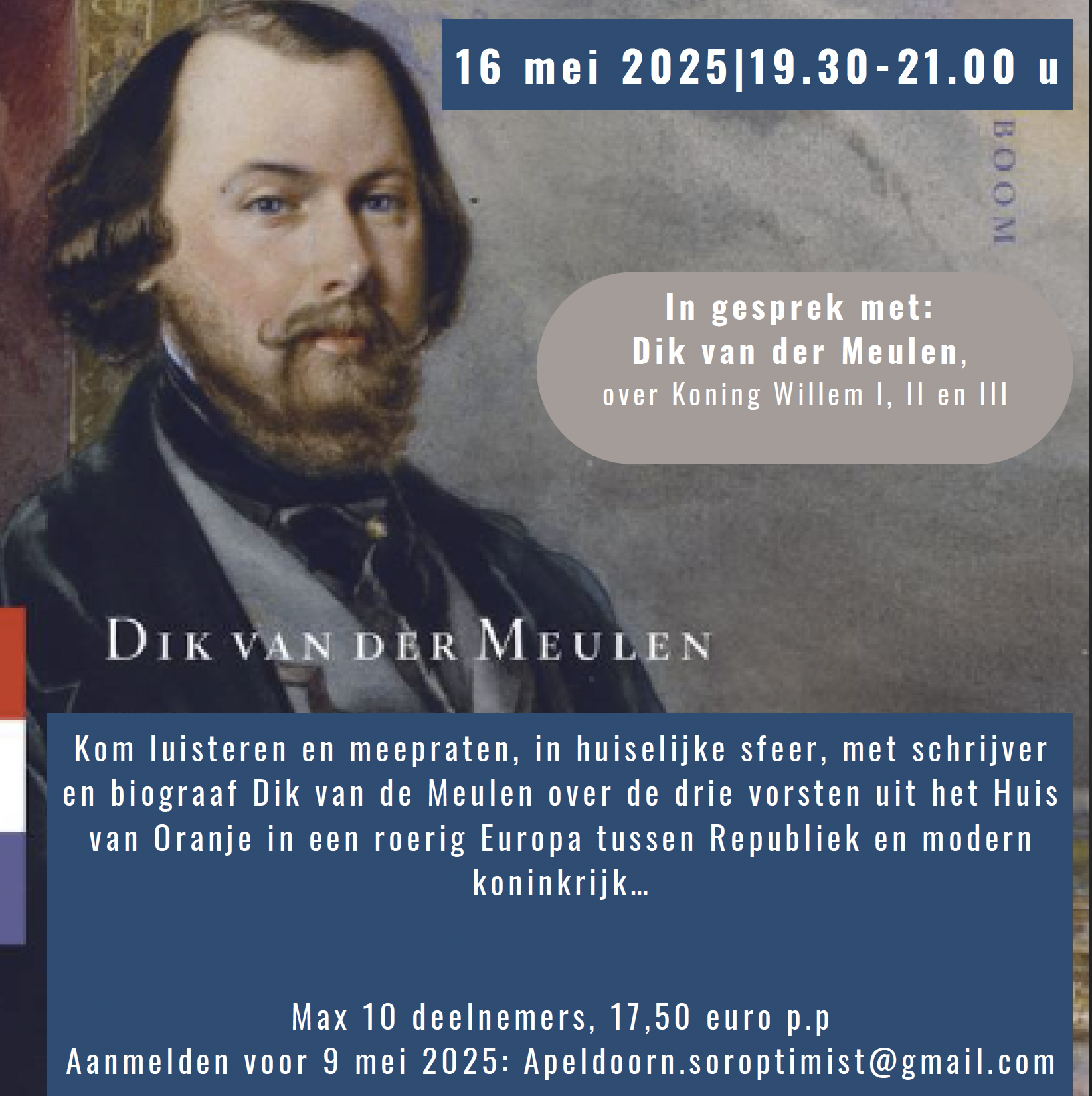 Workshop In gesprek met Dik van der Meulen 16 mei 2025 19.30-21 uur Kom luisteren en meepraten, in huiselijke sfeer, met schrijver en biograaf Dik van de Meulen over de drie vorsten uit het Huis van Oranje in een roerig Europa tussen Republiek en modern koninkrijk… Max 10 deelnemers, 17,50 euro p.p Aanmelden voor 9 mei 2025: Apeldoorn.soroptimist@gmail.com