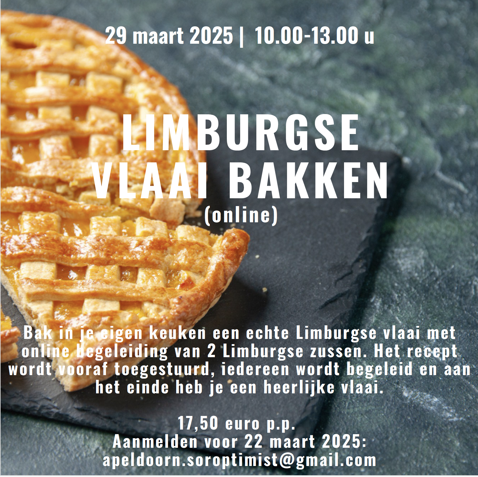 Workshop Limburgse Vlaai Bakken (online) 29 maart 2025 10-13 uur Bak in je eigen keuken een echte Limburgse vlaai met online begeleiding van 2 Limburgse zussen. Het recept wordt vooraf toegestuurd, iedereen wordt begeleid en aan het einde heb je een heerlijke vlaai. 17,50 euro p.p. Aanmelden voor 22 maart 2025 apeldoorn.soroptimist@gmail.com