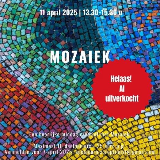 Workshop Mozaïek 11 april 2025 13.30-15.30 uur Een heerlijke middag creatief met Mozaïek. Deze workshop was in no time volgeboekt! Je kunt je helaas niet meer aanmelden!