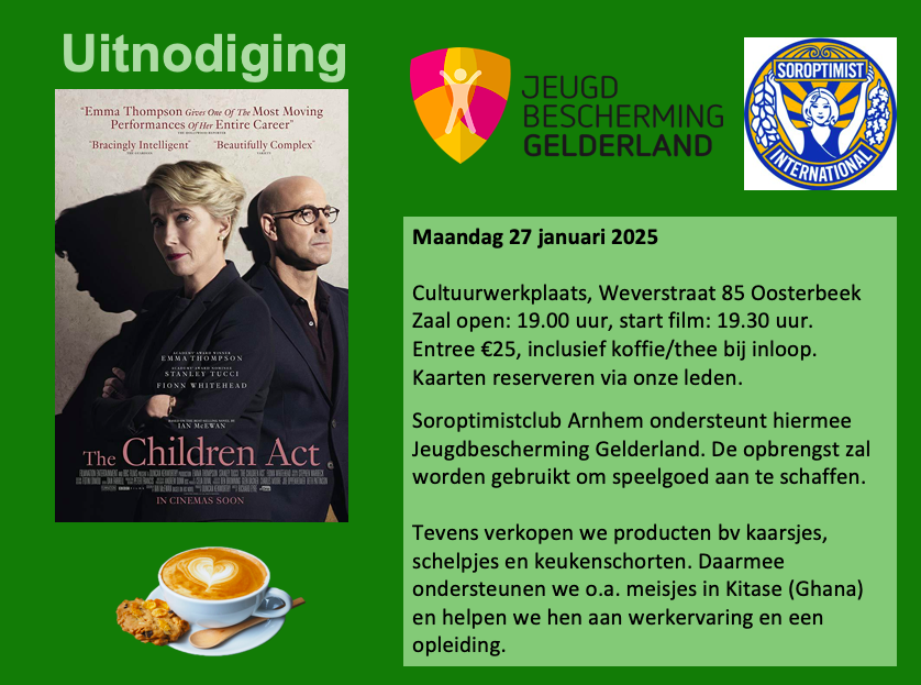 Maandagavond 27 januari 2025 organiseren we weer een filmavond in het filmhuis van Oosterbeek. Met deze filmavond ondersteunt de Soroptimistenclub Arnhem Jeugdbescherming Gelderland. De opbrengst zal worden gebruikt om speelgoed aan te schaffen.
