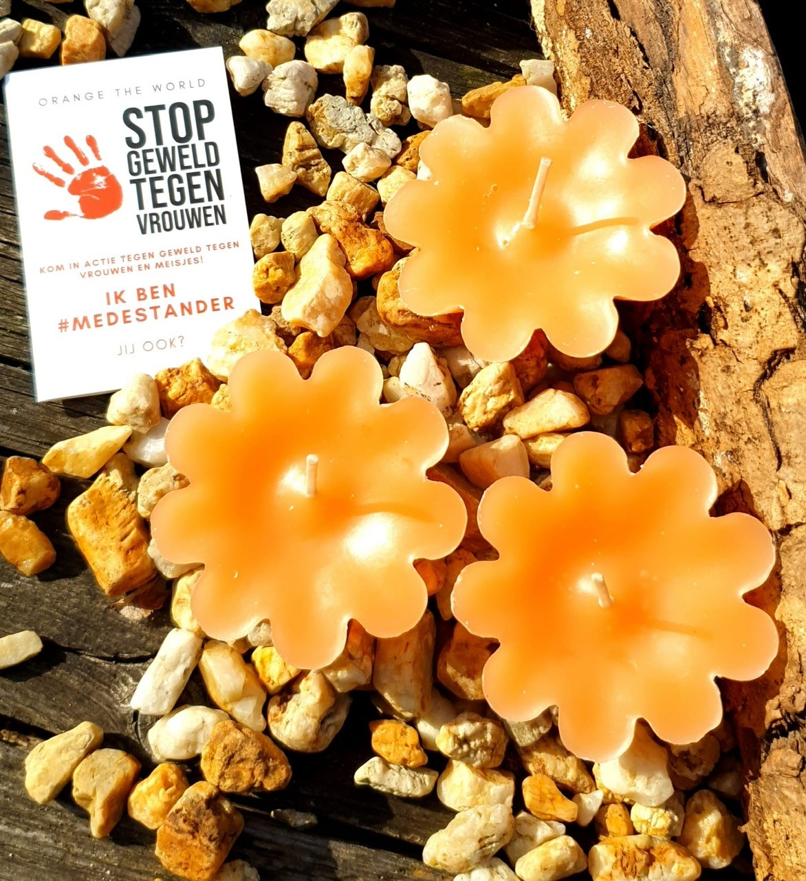 Ben jij ook #medestander van de campagne Orange the World? Steek dan een oranje drijfkaarsje aan als teken van licht en van hoop. De drijfkaarsjes zijn handgemaakt en ruiken lekker naar sinaasappel-perzik.