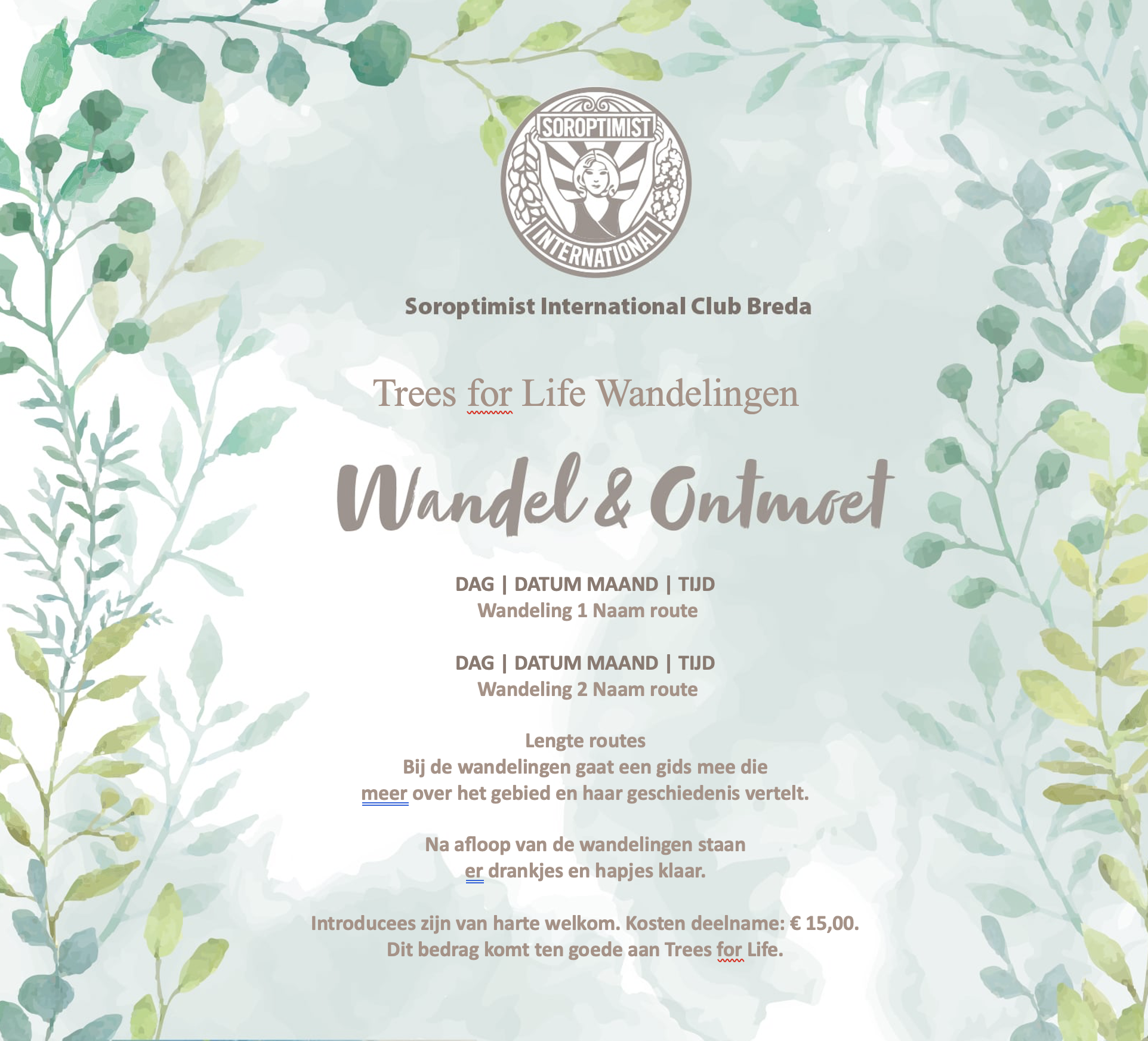 Regelmatig organiseert Soroptimist International Club Breda wandelingen voor Trees 4 Life. De wandelingen worden door de club geïnitieerd en georganiseerd onder begeleiding van een gids die het gebied kent en bijzonderheden vertelt over de flora en fauna, geschiedenis of het ontstaan van de plek. Na de wandeling is er een gezellig samen zijn onder genot van een drankje en hapje en is er soms ook de verkoop van producten. De opbrengst van de wandelingen en verkoop gaat in aftrek van kosten naar Trees 4 Life.