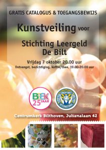 Kunstwerken worden voorafgaand aan de veiling twee weken geëxposeerd in etalages in de Bilt, Den Dolder, Maartensdijk en Bilthoven. Tijdens de veiling komen ook diverse items en cadeaubonnen van de winkeliers onder de hamer. Met elkaar voor een goede opbrengst voor Leergeld De Bilt! Klik hier voor een lijst van deelnemende winkels waar u de kunstwerken van tevoren kunt zien en alle kunstwerken en overige kavels al online kunt belijken. De veilingvoorwaarden kun je hier lezen.