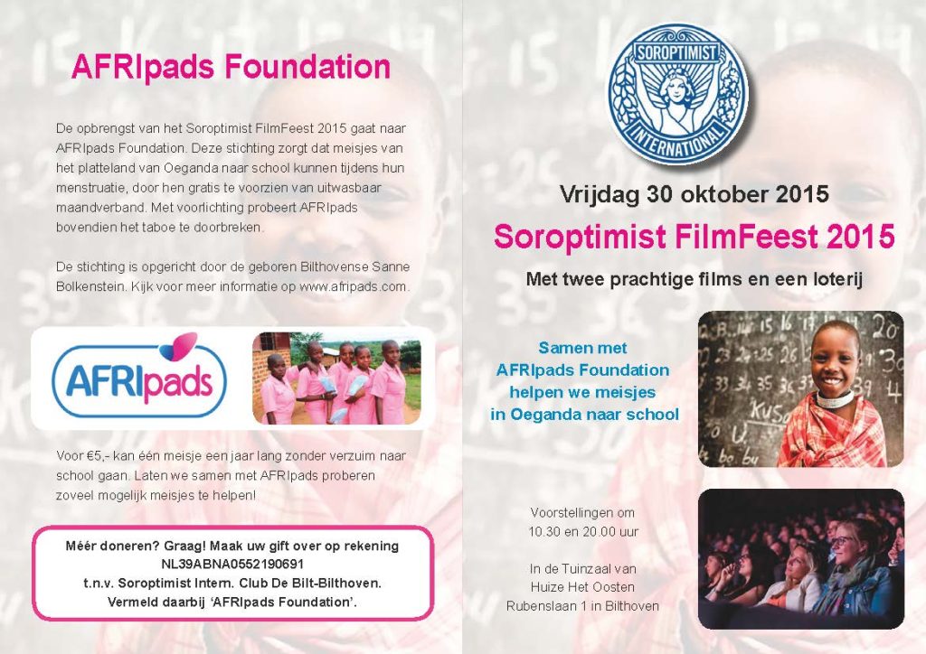 Nadat Soroptimistclub De Bilt-Bilthoven op 14 oktober 2015 al voor de 18e keer haar jaarlijkse bridgedrive had georganiseerd, werd op 30 oktober het FilmFeest gehouden. Dit laatste was een geheel nieuwe activiteit. De vier films voor de kinderen waren afgestemd op de leeftijd van zes tot en met twaalf jaar én op het thema van het (afgelopen) clubjaar dat in het teken van ‘Vrijheid’ stond. Alle circa 500 kinderen van de Julianaschool in Bilthoven werden met de hulp van vele leden van de club van een lunch – met onder andere veel broodjes knakworst! – voorzien. De kinderen betaalden voor de lunch en op vrijwillige basis voor de film. Op dezelfde dag werden in de tuinzaal van Huize Het Oosten voor volwassenen ’s ochtends en ’s avonds films vertoond. De bezoekers aan de avondfilm konden ook deelnemen aan een loterij.