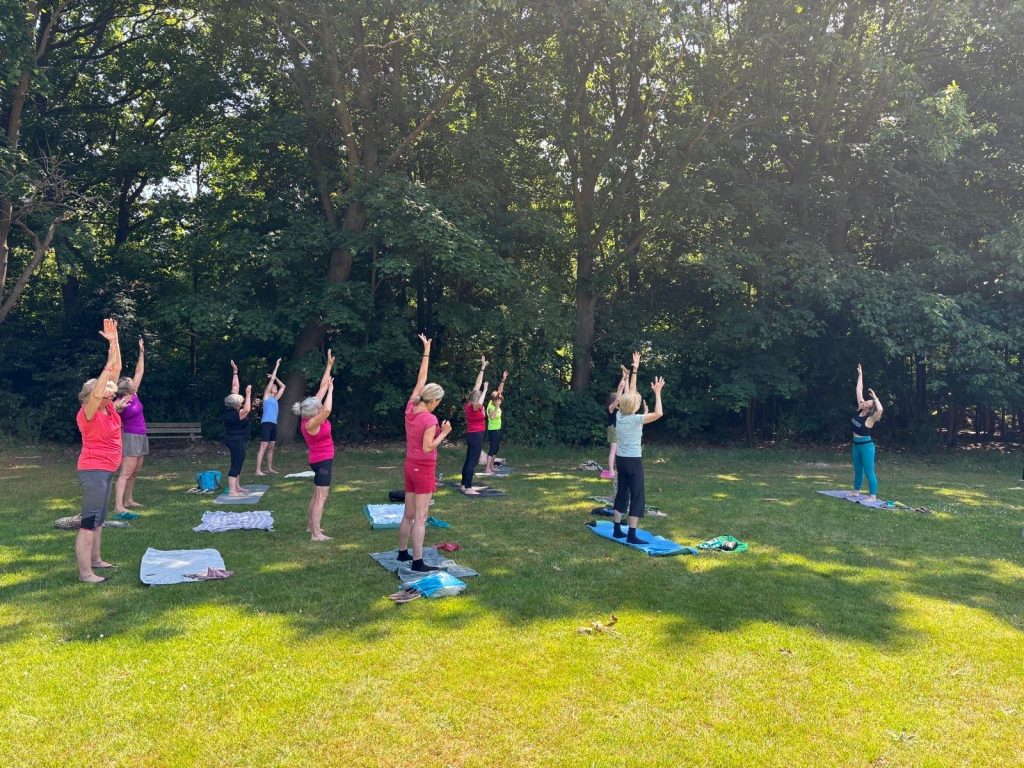 Een week later deden enkele tientallen deelnemers mee met twee workshops Essentrics in de openlucht. In de schaduw van hoge bomen en met uitzicht op het historische gemeentehuis Jagtlust van gemeente De Bilt leerden de deelnemers van ons clublid, Essentrics trainster Wendy Jacobs, technieken waarmee je je spieren kunt versterken én verlengen. Met Essentrics belast je alle delen van je lichaam op een rustige en verantwoorde manier. De workshop zorgde dan ook voor een heerlijk ontspannen gevoel naderhand!