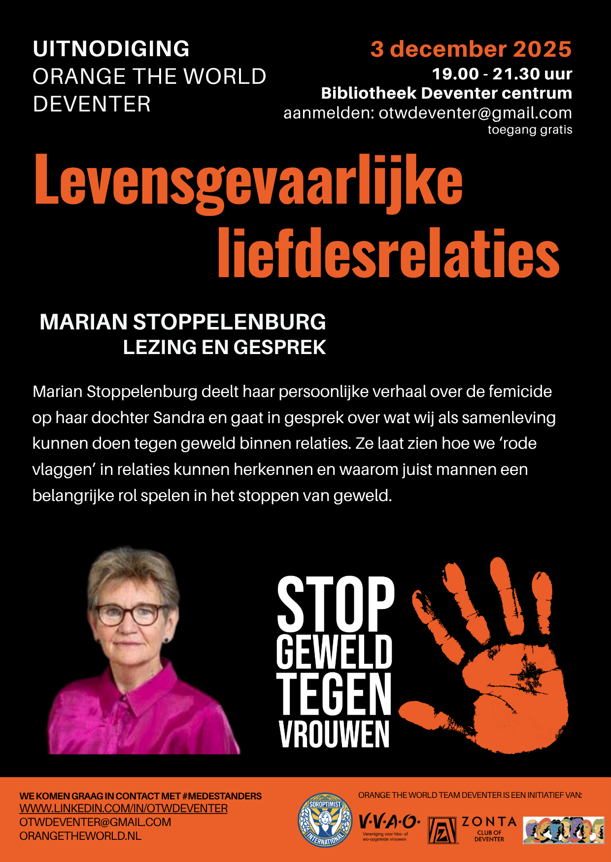 Orange the World – Lezing ‘Levensgevaarlijke Liefdesrelaties’ door Marian Stoppelenburg