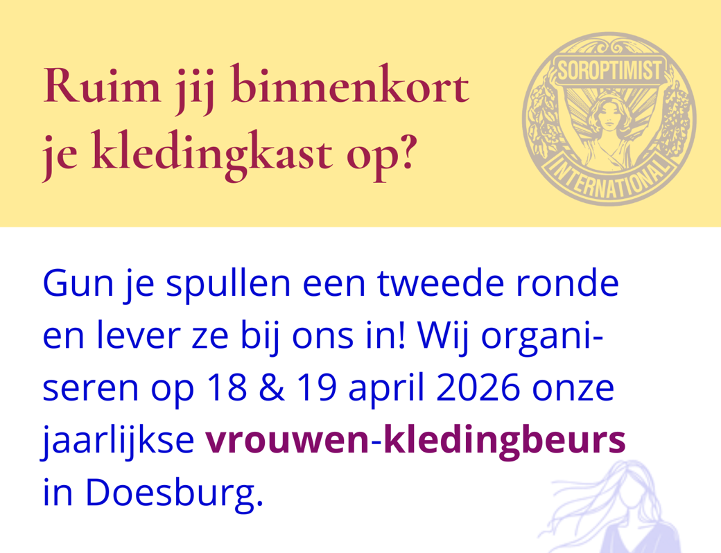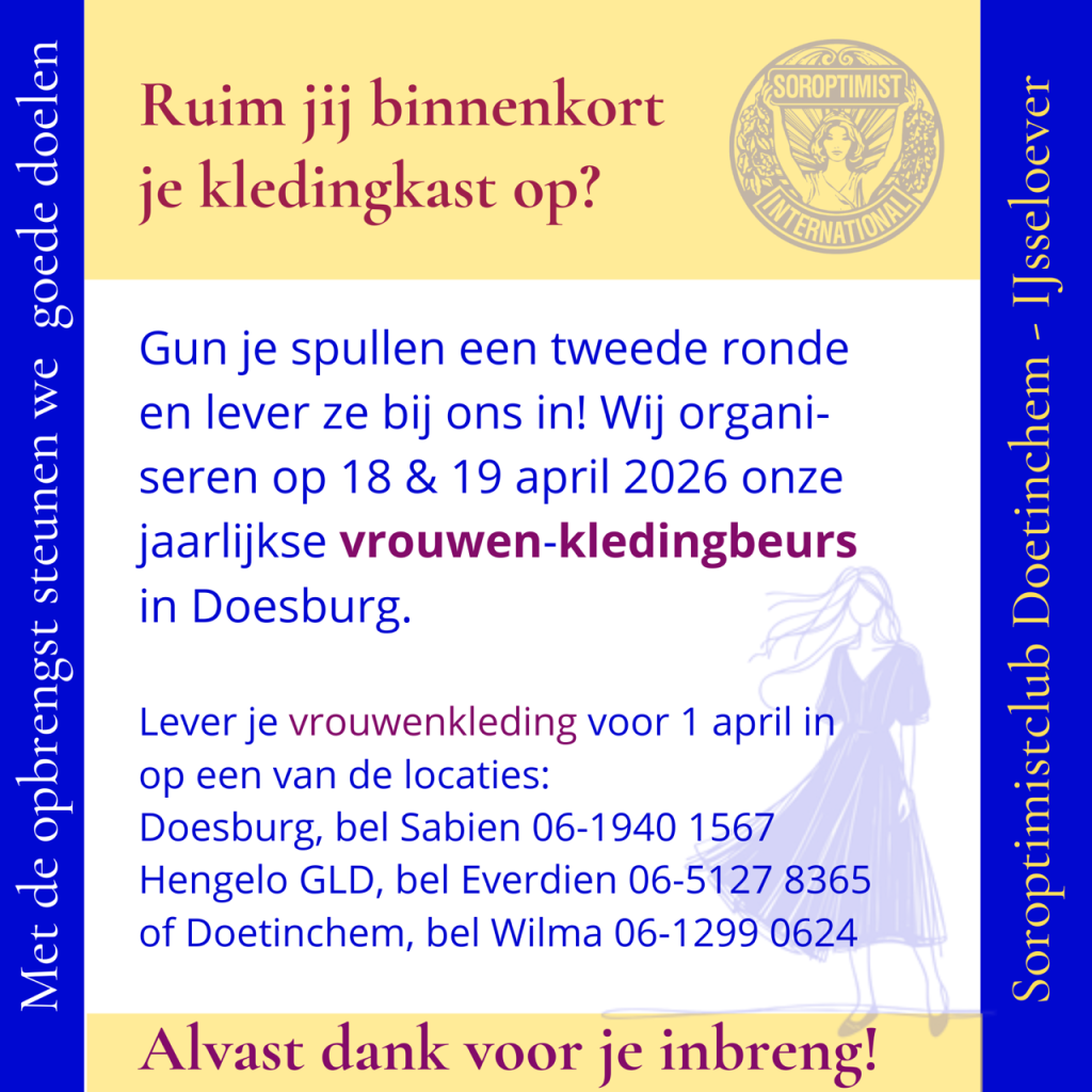 Voor onze kledingbeurs hebben wij ook mooie kleding nodig, van vrouwen en meiden. Wij nemen ook graag schoenen, tassen, sieraden, hoeden en sjaals, in goede kwaliteit, van je over. Dus start met verzamelen en lever het in bij een van onze leden van Soroptimistclub Doetinchem-IJsseloever. Mocht je niemand specifiek kennen, dan hebben we verzamellocaties ingericht in Doetinchem, Doesburg en Hengelo (gld), check hiervoor het bijgevoegde affiche. Hier kan je jouw mooie 2ehands spullen inleveren voor een nieuwe ronde!
