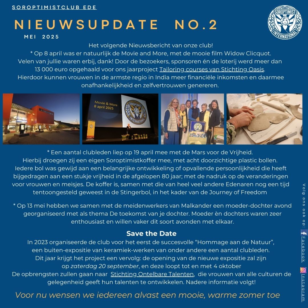 – Voor Vrienden van de club zijn we gestart met, onregelmatig te verschijnen, NieuwsUpdates. Lees hier de eerste editie van januari, of hier de tweede editie van mei; je kunt je ook abonneren op onze NieuwsUpdates, stuur dan een mailtje naar ede@soroptimist.nl