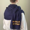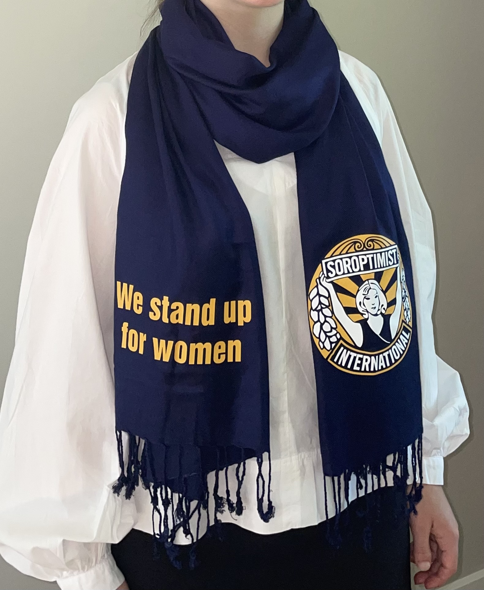 Marineblauwe viscose shawl met Soroptimist-logo in officiele kleuren aan de ene kant en de tekst ‘we stand up for women’ aan de andere kant.