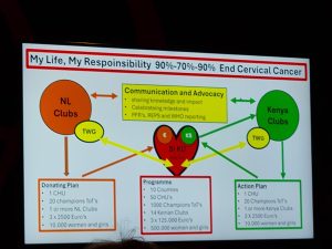Op 4 november sprak Mary Muia een aandachtig publiek in Lelystad toe over het project “Help HPV de wereld uit”. Sprekend vanaf een luchthaven in Engeland, omdat ze helaas Nederland niet in mocht, vertelde ze over de mooie start van het project in Kenia. Dankzij de bijdrage van club Flevoland kon daar een train-de-trainer programma gestart worden waarmee vrouwen geinformeerd worden over de risico’s en de mogelijkheden om baarmoederhalskanker, veroorzaakt door het HPV virus, te voorkomen.