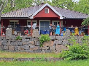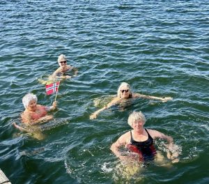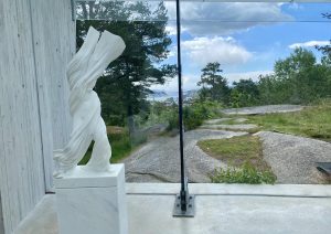 Zondag 9 juni: drukke dag, die begint met zwemmen in de fjord. Daarna natuurlijk ontbijt. Vervolgens rijden we naar het sculpturenpark Midtåsen en krijgen een rondleiding door het huis van Anders Jahre, een rijke reder en filantroop. De lunch, met worstjes van de bbq en door de Noorse sorren zelfgebakken taarten, is voorbereid op Preståsen en wordt buiten geserveerd. Daarna is het borreltijd, voordat we naar het restaurant Del Mare gaan.