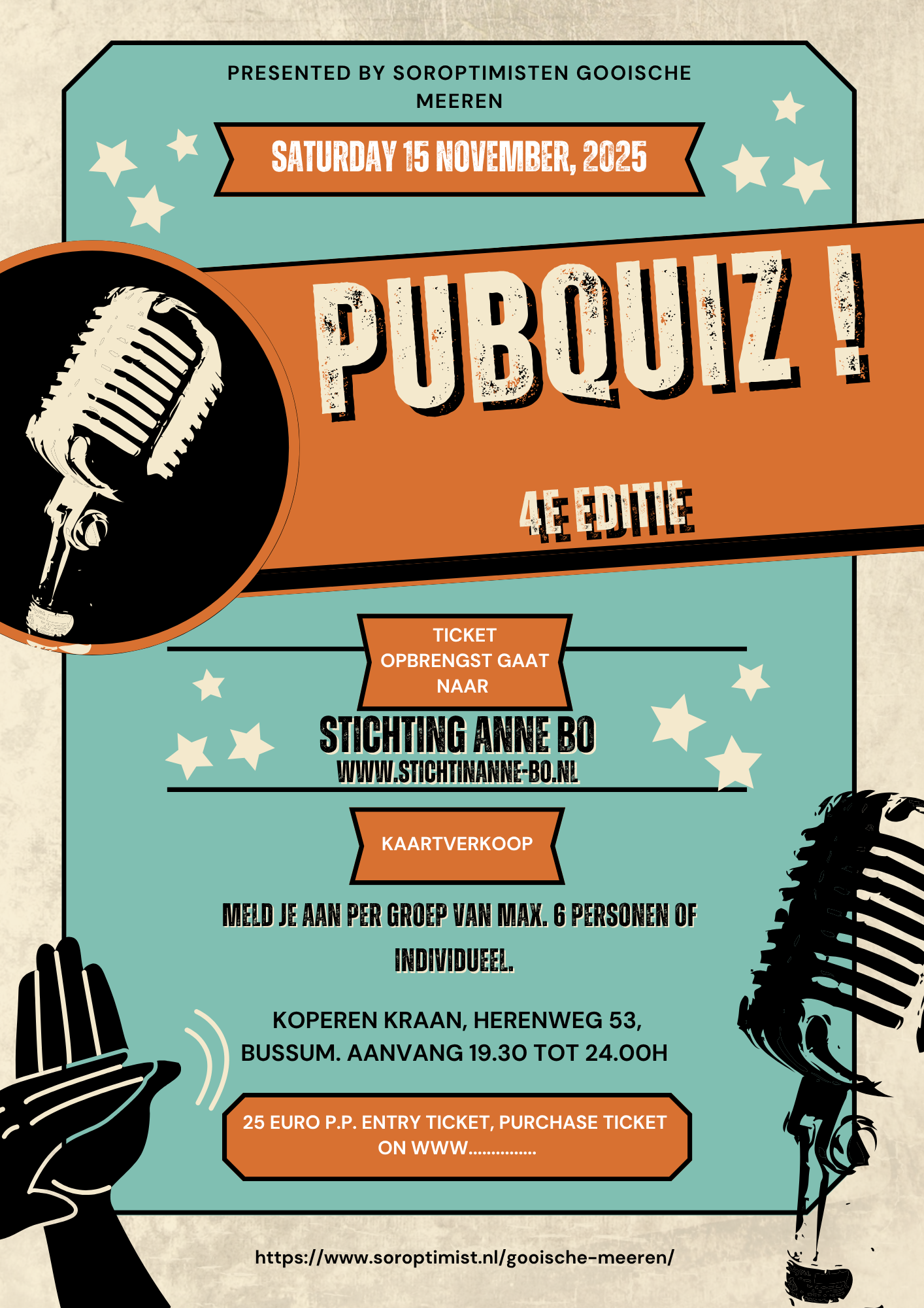Op 15 november 2025 organiseren de Soropitimsten international Gooische Meeren voor de 4e keer een pubquiz. Onder professionele begeleiding strijden we voor de wisseltrofee en andere mooie prijzen.