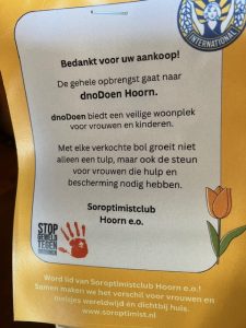 Om een veilige woonplek van vrouwen en meisjes te ondersteunen verkopen wij tijdens deze markt biologische Oranje tulpen; de opbrengst gaat naar dnoDoen Hoorn. Zij bieden deze veilige plek aan vrouwen en meisjes.